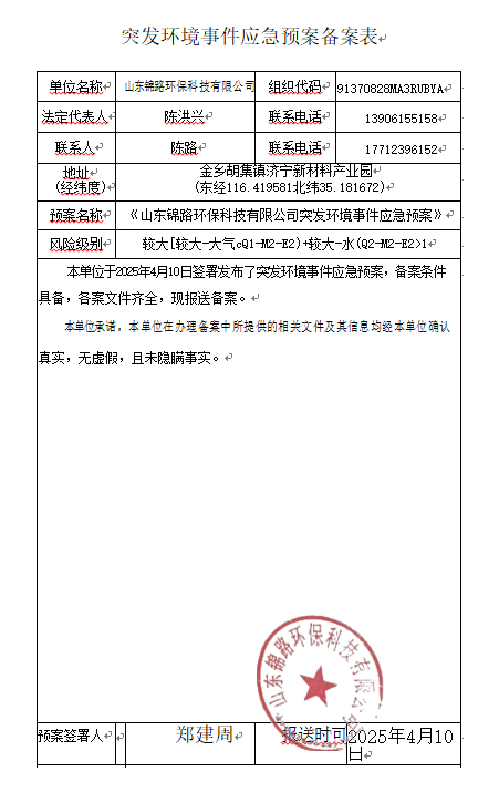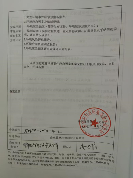 | 山东锦路环保科技有限公司能结合国家有关环保法律、法规,以及各级环保主管部门的规章制度、管理条例,建立和健全各项有关的环保管理制度,并编制和落实了企业的环境风险预案,能够严格遵守国家各项环保法律、法规。报告期内,没 有发生过重特大环境污染事故。 |
